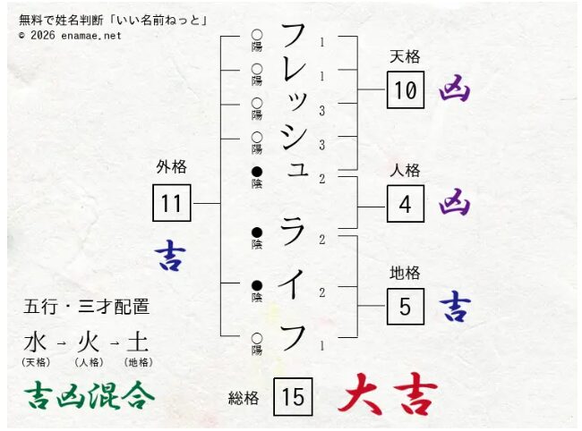 かつて、大手メーカーから「フレッシュライフ」という名前の靴下が発売されました。 抗菌・防臭機能を持つ画期的な商品で、名前の画数は総画数15画。